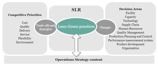 In addition, it is important to mention there are some systematic reviews that focus on Lean-Green [4,36,54,55,56,57,58,59]. However, these studies do not consider the relationship of Lean-Green and Operations Strategy content (competitive priorities and decision areas) to understand the trade-offs, synergies and changes in the decision areas. Considering the relevance of the operations function–for the organization’s competitiveness, the current stakeholders’ requirements, and the lack of studies on LG practices from the perspective of the consolidated background of OS–this study aims to provide a broad perspective on the possible impacts of adopting LG practices on the content of OS, highlighting the occurrence of synergies and tradeoffs between competitive priorities and the changes promoted in decision areas. Thus, this work seeks to take a step towards systematizing contributions from studies that have addressed issues related to constructs in the field of OS—competitive priorities and decision areas—when LG practices are implemented, and to update and expand this part of part of a doctoral thesis developed in 2021 by Queiroz et al. [60]. With this objective, a Systematic Literature Review (SLR) and a content analysis of 338 articles were carried out from 1996 to the present moment. The results can contribute to a better understanding of the trade-offs and implementation practices aligned with corporate sustainability objectives, allowing the development of well-positioned production systems that can meet new market demands and be consistent with the global strategy of the company.