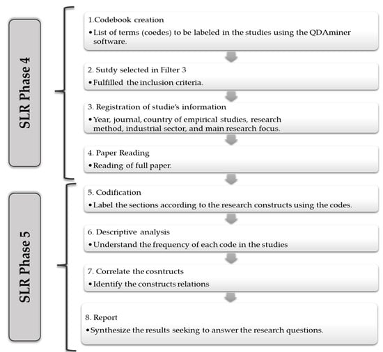 After Filter 3, an analysis of 338 papers was done in full, aimed at extracting specific information from studies related to the research topic. In this filter, the articles were analyzed in a descriptive manner, seeking to generate a classification of the articles by year, journal, country of empirical studies, research method, industrial sector, and main research focus. Moreover, a content analysis was made by following the recommendations of [88] seeking to answer the research questions (RQs). The QDA Miner Software (Version 5) was used as a tool to facilitate the analysis process (individual papers and cross-papers). According to ref. [89] et al., this software collaborates in the organization of ideas and comparison between the cited. The analysis steps are presented in Figure 3.
