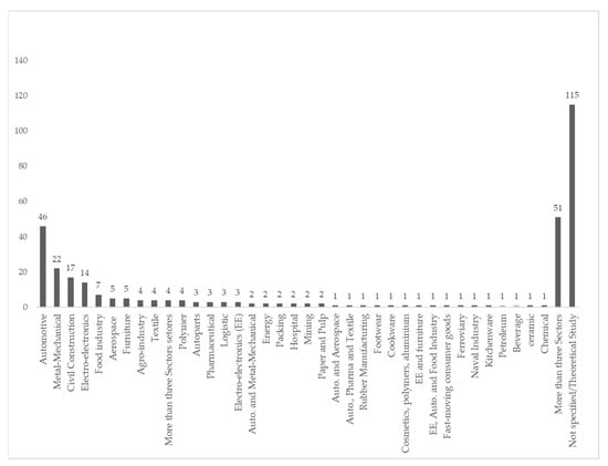 Furthermore, Figure 7 presents the classification of the empirical studies regarding the industrial sector and the country, where the study was done and the size of the organizations. Regarding the industrial sector where empirical research was done, the three most frequent sectors were automotive, metal-mechanical, civil construction and electro-electronics, corresponding to 36.66% of the empirical studies.