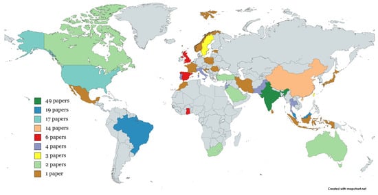 As for the location, the majority (around 45%) of the research was done in India, Brazil, Malaysia, the United States and China. UNCTAD (United Nations Conference on Trade and Development) [91] developed the status classification. Only the US is classified as a developed economy, while the other ones are classified as developing economies. Therefore, these data can mean that countries that focus on developing their economies are seeking practices to improve competitiveness sustainably. Figure 8 presents a global map with the papers’ distributions, and Table 1 presents a distribution of the papers per country of empirical studies.