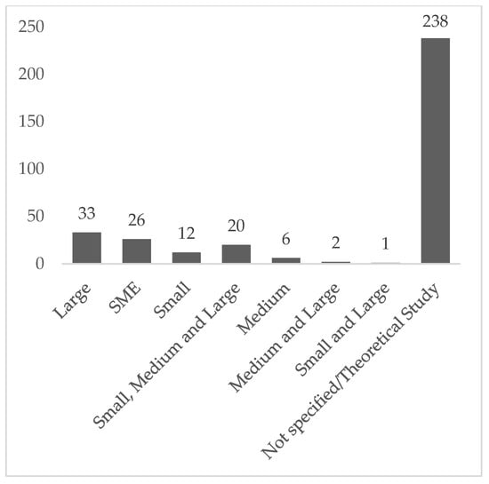 Regarding the size of the companies in the empirical studies, Figure 9 representd that only 100 studies identified it, with 12% studying large companies, 9.62% studying SMEs companies, and 4% the small companies; 7.4% were done with a mixed sample including small, medium and large, and another 2.2% represented medium companies.
