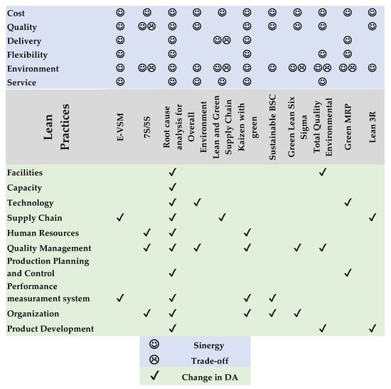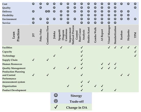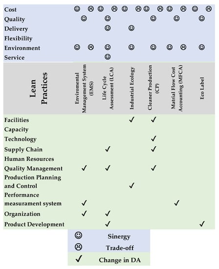 This topic explains the LG Practices and it shows the links with OS in Figure 8. They are described in more detail because they represent a consolidation of LG integration. These practices take the LP as a foundation and include the environment as a target of the improvements. This integration is one of the main steps for a LG practice and it helps to solve the trade-offs. In Figure 12 we can represent the Lean-Green practices relations with trade-offs, synergies and changes in DA.