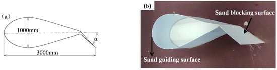 It is a sand barrier that dominates the existing railroad sand control projects. Its fundamental principle is to significantly reduce the wind speed near the surface and weaken the intensity of sand transport. Thus, it achieves the effect that the sand is not affected by the wind [6]. Researchers have conducted many numerical simulations, wind tunnel tests, and field experiments on various structural forms of sand barriers and their effect on wind and sand control. They have also analysed the mechanism of wind and sand disaster control [7,8]. Horvat et al. [9] used computational wind engineering methods to simulate local wind and sand flows to obtain ground shear stress fields and derive sand deposition/erosion patterns. The simulated deposition/erosion patterns are qualitatively consistent with the field evidence observed along desert railroads. Based on wind tunnel tests and numerical simulations, Song et al. [10] evaluated the railway catenary’s wind deflection under crosswind. Sarafrazi et al. [11] simulated air and sand particles using Eulerian and Lagrangian models to determine the correlation between the distance behind the barrier to prevent sand deposition and the height of the barrier at different wind speeds. The effect of sand blocking is mainly influenced by the geometry of sand barriers, such as height, spacing, angle, etc. [12,13]. Fang et al. [14] suggested that double and triple rows of sand barriers were optimal for reducing wind speed, which was confirmed in a subsequent study [15]. The optimal sand barrier spacing of 6–8H (H is the height of the sand barrier) was recommended by Papesch [16] and Wu et al. [17]. Kim et al. [18] established a CFD model considering design characteristics such as wind speed and wind fence height to evaluate the wind speed reduction effect of wind fences quantitatively. Bo et al. [19] used a wind tunnel study to conclude that wind speed and sand particle size had no significant effect on the distribution pattern of the falling velocity of sand particles. Wang and Yan used wind tunnel tests to simulate the variation of flow field structure and wind speed for various models [20,21]. Some sand control measures were applied in engineering practice and achieved good results [21]. However, the existing sand barrier measures can only play a role in blocking and fixing the wind and sand flow; it does not have the effect of guiding and diverting. With time in the field, severe sand burial and accumulation in the continuous sand transport area will occur. As the sand accumulation near the sand barrier measures increases, resulting in the sand barrier measures being gradually buried, the efficacy of the sand barrier is reduced significantly. The surrounding sand accumulation must be removed periodically to maintain effectiveness [20]. The current sand accumulation cleaning is mainly carried out manually or mechanically. However, due to the long lines and the high cleaning and maintenance costs, it is difficult to solve the problem of sand blocking fundamentally.