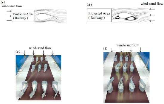 The structure of the new sand barrier is shown in Figure 1a,b, and its working principle is shown in Figure 1c–f. As shown in Figure 1c,e when the sand barrier is used to block the sand, the sand flow is forced to consume much kinetic energy during the climbing period, which reduces the sand carrying capacity. When the sand flow crosses the sand blocking surface and continues to run under the effect of the inverse pressure gradient, a vortex flow is formed behind the sand blocking surface. The speed of the sand flow in this area is significantly reduced. Because the velocity of airflow movement is less than the wind speed of the sand particles themselves, the sand particles are forced to settle under the action of their gravity, forming an apparent sand accumulation. As shown in Figure 1d,f, when the role of the sand barrier is to divert the sand flow, the sand barrier is configured in such a way that a narrow tube effect is created between adjacent sand barriers. The energy behind the first row of sand barriers is volatile, forming a turbulent area with vortices of different sizes, which increases the energy of the near-surface sand flow and accelerates the sand flow, carrying away the sand particles deposited between the sand barriers. Once sand accumulation occurs, it can be removed by natural wind power, thus saving a lot in workforce and material resources.
