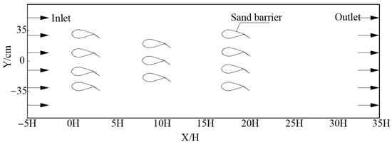 The wind tunnel test mainly monitors the wind speed variation around the sand barrier and the wind-sand flow structure. Wind speed was measured by a measurement system consisting of a Pitot tube connected to a micro differential pressure transmitter. The wind speed data were recorded automatically by computer with a frequency of 1 s. In order to obtain a more stable and accurate wind speed, each recording time was 5~7 min, and the average value was taken for three tests. The wind speed was collected at 1 cm, 2 cm, 3 cm, 5 cm, 7 cm, 10 cm, 15 cm, 30 cm, and 50 cm. The wind speeds of 6 m/s, 8 m/s, and 10 m/s were selected for the wind speed observation without the sand barrier model (empty field) and with the sand barrier model. The sand barrier model was fixed during the test in the wind tunnel test section (Figure 2). The location of the first row of sand barriers was taken as 0H, the left side of the first row of sand barriers was the windward side, and the area between the sand barriers was the transition area. The right side of the last row of sand barriers was the leeward side. The detailed distribution of wind speed measurement points is shown in Table 1, where H is the height of the sand barrier, and the negative value represents the windward side of the sand barrier.