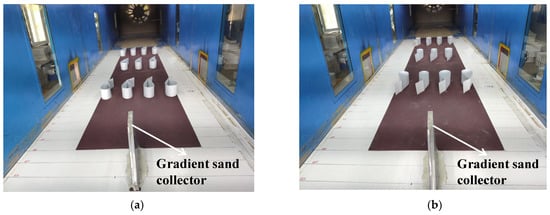 In the wind-sand flow monitoring experiment (Figure 3), sand was spread uniformly in the wind tunnel with a thickness of 5 cm. To ensure uniform mixing of wind and sand, sand was laid at 10H on the left side of the first row of sand barriers. The gradient sand collector was located at 7H after the last row of sand barriers. The sand collector was equipped with 10 sand collection ports in the vertical direction with a cross-sectional area of 20 mm × 20 mm, and a corresponding sand collection box was connected to the rear side of the said sand collection port for collecting sand volume during the experiment. The blowing of the model without a sand barrier (empty field) and the placed sand barrier model was carried out under wind speeds of 6 m/s, 8 m/s, and 10 m/s. At the end of the experiment, the sand collected from each layer on the sand collector was weighed using a 0.001 g precision electronic balance.