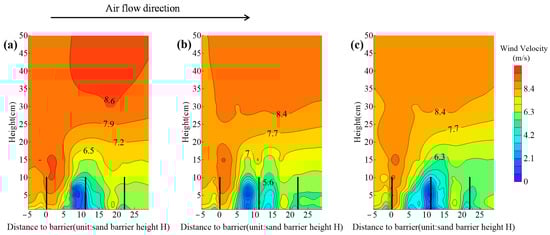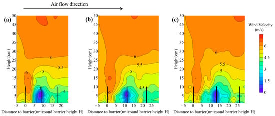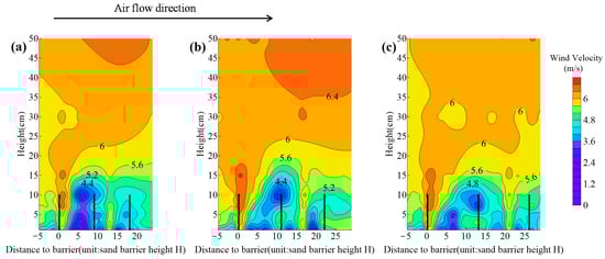 Contour diagrams of airflow velocity around the sand barrier at different pitch gradients: (a) 6H; (b) 8H; (c) 10H. The wind speed in this example is 6 m/s and the angle is 30°.