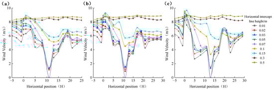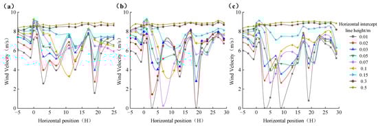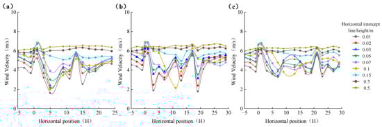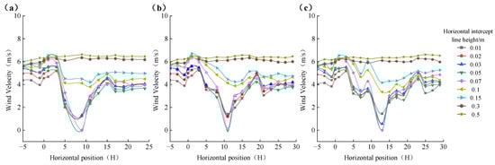 Variation of horizontal wind speed around the sand barrier at different spacing gradients: (a) 6H; (b) 8H; (c) 10H. The wind speed in this example is 6 m/s and the angle is 30°.
