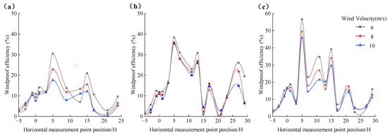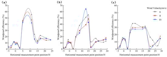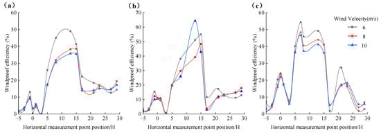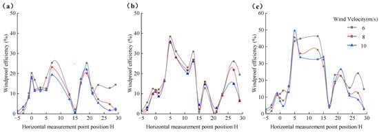 Variation of wind protection effectiveness of new sand barriers with different spacing (sand guiding effect): (a) 6H; (b) 8H; (c) 10H.