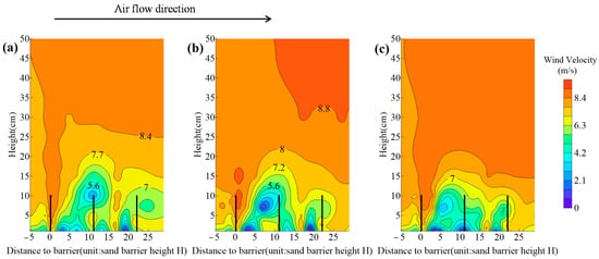 Contour map of airflow velocity around the sand barrier at different angle gradients: (a) 30°; (b) 45°; (c) 60°. The wind speed in this example is 8 m/s and the spacing is 8H. In order not to affect the display of the results, the location of the left side of the sand barrier is indicated by a black vertical bar in the figure.