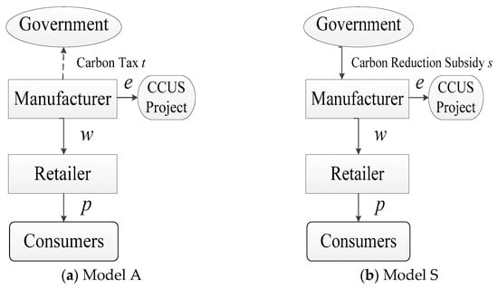 As the role of CCUS projects in carbon emission reduction continues to be highlighted, the world is accelerating the investment in and construction of CCUS projects. The data from the International Energy Agency (IEA) predicts that total investment in CCUS projects will total USD 67.09 billion in the period 2026–2030, which could increase to USD 776.61 billion in the period 2056–2060 [9]. The carbon emission reduction incentive policy initiated by the government is an important way to promote enterprises to invest in CCUS projects and implement carbon emission reduction [10]. The incentive policies mainly include mandatory policies and voluntary policies [11]. Mandatory policy means that the government adopts a mandatory carbon control mechanism to regulate the high emission behavior of enterprises. Carbon cap and carbon tax are two common types of mandatory policies [12]. With a carbon cap policy, the government issues fixed carbon emission quotas to enterprises and prohibits them from exceeding carbon caps [13]. Cap-and-trade policy is a deformation of the carbon cap policy. It allows enterprises with insufficient and surplus allowances to buy and sell carbon emission rights in the carbon trading market [12]. With a carbon tax policy, the government imposes a carbon tax on enterprises that emit CO2 [14]. To sum up, the mandatory policy is regarded as a penalty policy. In contrast, the voluntary policy is a reward policy. Typical voluntary policies include pure carbon trading policy and low-carbon subsidy policies. With a carbon trading policy, the CO2 emission reductions are quantified as CERs. Enterprises can obtain a profit from selling CERs. With a pure carbon trading policy, manufacturers are not penalized for not implementing carbon reductions [11]. With the low-carbon subsidy policy, the government provides subsidies to the enterprises that implement carbon emission reduction [15].