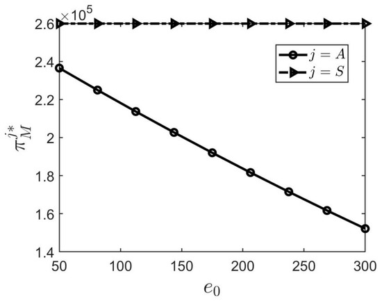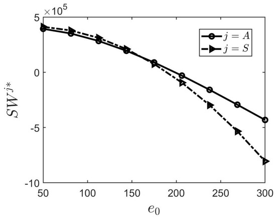 In this part, we explore which model has lower carbon emissions, and higher economic efficiency and social welfare by comparing models A and S. Figure 3, Figure 4, Figure 5 and Figure 6 are illustrations of the comparison results. As shown in these figures, the profits of the supply chain members and social welfare are decreasing or unchanging in the product initial unit carbon emissions. The total carbon emissions increase as the initial unit carbon emissions increase. The results verify Propositions 2 and 6.