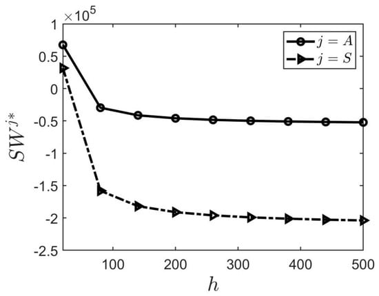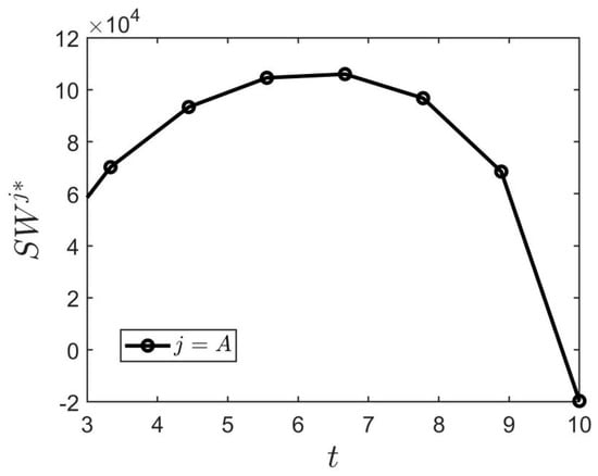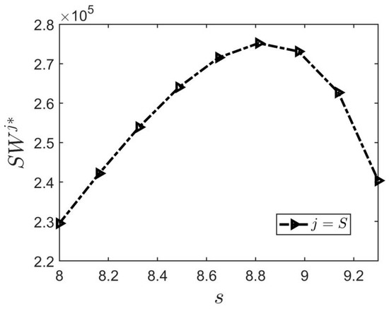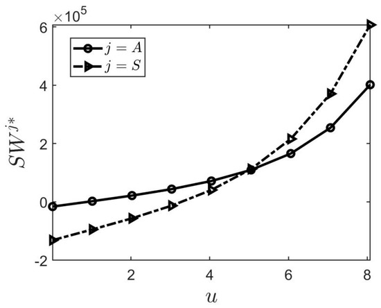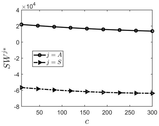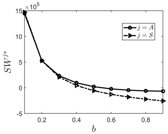 Then, we conduct the numerical study from three aspects. First, we compare the two models to answer which model has higher economic efficiency, environmental performance, and social welfare. Second, we analyze the effects of main parameters on social welfare and address the managerial insights. The results of our experiments are shown in Figure 3, Figure 4, Figure 5, Figure 6, Figure 7, Figure 8, Figure 9, Figure 10, Figure 11 and Figure 12 (The * in the figures depicts the optimal results).