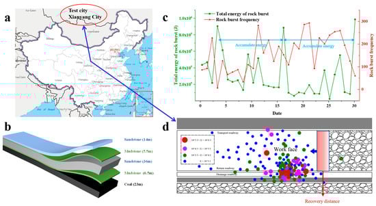 As depicted in Figure 1a, the mine is located in the north western part of Xianyang City, Shaanxi Province at an altitude of 1170–1200 m. The No.4# coal seam was being extracted, the thickness of which varies from 12.8 to 27 m with an average value of 23 m. Considering its mining depth of 592 to 810 m, this mine is representative of deep underground coal mines. The distribution of the strata located near the working face is shown in Figure 1b, in which a thick layer of hard medium sandstone lies upon the coal seam. The recovery roadway shown in Figure 1d is 5.6 m wide and 3.7 m high, along which are 30 mm coal pillars. After extraction of the workface, the rock burst shock waves (Figure 1c) were recorded and strong ground pressure behavior featuring roof subsidence were observed.