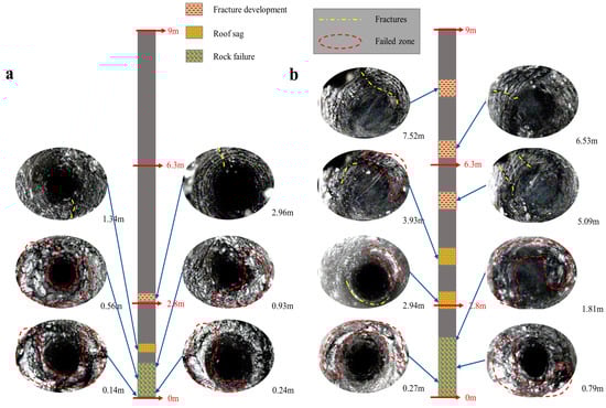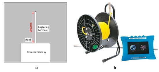 As shown in Figure 2a, vertical exploration boreholes with a length of 9 m and a diameter of 30 mm were drilled along the center line of the roadway roof during the excavation and recovery processes. To reduce the side effects of coal extraction, the boreholes were set 50 m behind the excavation working face and 80 m in front of the recovery workings. YTJ20 borehole camera exploration equipment (Figure 2b) was applied, the observations of which are illustrated in Figure 3a. Multiple original joints and fractures in the shallow part (h ≤ 2.8 m) were observed, and the separation area of the rock formation was seen to be distributed around 3 m where the roadway roof was relatively complete. In contrast, a roof crack and fracture developed around a depth of 5~7.52 m, as can be seen in Figure 3b. Most importantly, the roof crack extends through to and appears as annular fractures at 2.8~4 m, and there are a large number of annular fractures and broken zones in the roof around 0~2 m.
