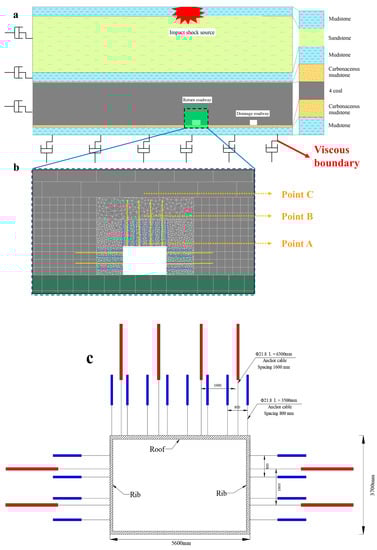 where f is the frequency of the shock wave (100 Hz) and is the initial phase angle (0°). A total of four shock waves were applied to the numerically calculated model. The source of the earthquake was located at the model boundary 71.3 m above the roof of the recovery roadway.