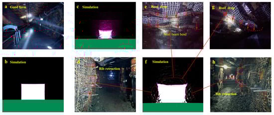 The same “excavation—stabilisation—recovery” excavation technique and route as the coal mine was used to numerically simulate the stabilisation and recovery periods of the roadway. Low-energy rock bursts were frequent in the ribs during roadway excavation, but there were no high-energy earthquakes. Figure 5a,b show the deformation of the rock surrounding the roadway under field investigation and in the numerical simulation with the shrinkage of roof to floor and between the ribs controlled to within 140 mm. During the recovery of the working face, the roof to floor and two ribs of the roadway were significantly deformed by the high frequency and high energy of the far-field earthquakes. Figure 5c–h show the shrinkage deformation of the roadway under field investigation and in the numerical simulation. Under the influence of the original rock stress and shock wave vibration, the deformation of the roadway is severe: the roof and floor move by 958 mm and the sides by 639 mm. However, the deformation in other roadway sections was far lower than this value. The steel beam of the roadway was violently bent and broken. Due to the requirements of coal mine safety, the floor heave was quickly resolved.