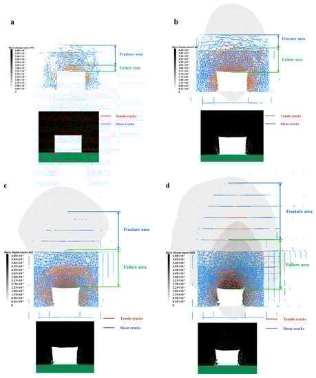 The crack distribution and fracture characteristics in the rock around the roadway subjected to different earthquake cycles are shown in Figure 6. It can be seen that multiple cracks developed in the surrounding rock within 3.5 m of the roadway roof when the first mine earthquake occurred. During this period, fracture penetration damage is mainly in the form of shear-slip damage (Figure 6a). After the second earthquake, the layer separation of the roof expanded to 4.2 m, all surrounding rock within 3.5 m failed, and the fracture zone extended to 6.3 m above the roof of the recovery roadway (Figure 6b). After the third earthquake, the fracture penetration was damaged at the 6.3 m height range, and the crack area expanded to 9 m above the roof (Figure 6c). When the fourth mine earthquake occurred, the roof failure area reached 8.3 m and cracks extended to 12 m (Figure 6d).