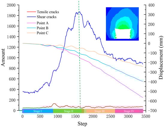 It has been well noted that cracks in the surrounding rock will extend progressively after the excavation of a roadway. To monitor the damage and fracture extension of surrounding rock subjected to the combined effect of mining stress and shock waves, a FISH function was developed. Usually, intact rock will continue to collect microfractures in the initial stages, and these fractures will interconnect with each other, eventually producing plastic failure of the rock mass. Figure 7 shows the number of fractures and displacements in the rock surrounding the roadway after the rock burst. It can be classified into different stages as per the time course of the shock waves. In stage Ⅰ, the development of fractures was relatively slow and only limited deformation of the roadway was observed. In stage II, the number of shear-slip fractures rose rapidly, reaching a peak of 1841, while the number of tensile fractures rose briefly to a peak of 127 and then fell rapidly. Although the process stabilised eventually, the speed of roof subsidence exhibited an increase. During stage III, the number of shear-slip fractures in the surrounding rock decreased rapidly and significantly by 47.70%, while the number of tensile fractures continued to fluctuate and then stabilise. Meanwhile, the amount of roof subsidence also increased significantly. Note that the number of shear-slip fractures decreased slowly and tensile fractures were almost unchanged during stage Ⅳ. However, the roadway was rapidly closed due to the total failure of the surrounding rock.