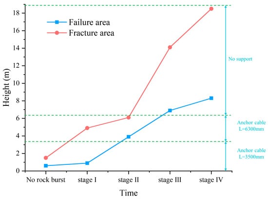 Figure 8 shows the change in roadway roof height after shock dynamic loading in the failure and fracture areas. The height of the failure zone changed little after the first mine earthquake occurred and rose rapidly thereafter. This observation is essentially the same as the characteristics shown in Figure 7. The four earthquakes contributed to the continuous rise in height of the fracture area. Note that the failure zone of the roadway roof was 8.2 m, which exceeded the effective support zone of the 6.3 m anchor cable being used.