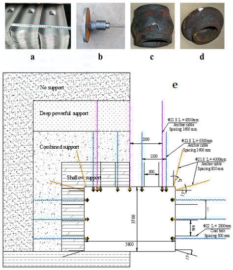 As shown in Figure 9, high-strength and high-preload left-handed deformed steel bolts with a diameter of 22 mm and length of 2800 mm were used, the spacing of the bolts set to 900 mm × 800 mm. The original 19 steel anchor cables with a diameter of 21.8 mm and length of 6300 mm were used, and new steel anchor cables with a diameter of 21.8 mm and length of 9300 mm were set to strengthen the scheme’s deep anchoring and enhance the suspension effect on the shallow surrounding rock. The spacing of these deep anchoring steel cables in the roadway was set at 2000 mm × 1600 mm with three cables per row. In shock wave failure, the deformation control on both sides of the roadway was relatively ideal. Shallow and combined support techniques were selected for the two sides with 6300 mm anchor cables also used for support to stabilise the rock walls. The spacing of these cables was set at 1100 mm × 1600 mm All of the anchor cables were connected in series with an energy absorption device to absorb impact energy, as shown in Figure 9b–d.