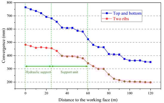 The deformation characteristics of the recovery roadway with the above optimised support system are shown in Figure 10, from which it can be seen that the surrounding rock was controlled effectively. It is clear that mine earthquakes and front abutment pressure affected the area within 110 m of the working face. Most importantly, roof-to-floor convergence reached 771 mm and rib-to-rib contraction reached 489 mm, representing respective reductions of 48.90% and 44.24% following the implementation of these support measures. The results demonstrate the effectiveness of the optimised support system in controlling the deformation of the surrounding rock.