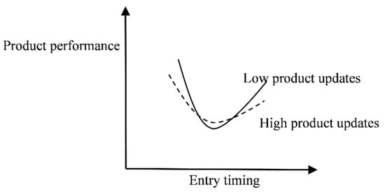 Entrepreneurial firms that benefit from first-mover advantage will achieve higher product performance if they pay more attention to product updates. First, frequent product updates indicate that entrepreneurial firms are attempting to adapt to the rapidly changing digital environment [16], which can enhance early entrants’ resource preemption advantages. This process enables entrepreneurs to quickly identify market opportunities and grasp demand changes, resulting in the effective use of valuable and heterogeneous resources in response to customer demand. For example, through continuous updates, entrepreneurs can provide products that are more compatible with the platform. Product updates increase the scarcity and inimitability of resources [51], which prevents subsequent competitors from surpassing the first movers to some extent. Second, frequent product updates indicate that entrepreneurial firms have the potential for continuous innovation [18], which can enhance early entrants’ product cost advantages. Sustained innovation potential requires the use of technologies such as patents, copyrights, and trademarks. These technologies promote the improvement of product processes, the reduction of cost input, and the formation of experience and scale effects [52], resulting in high-quality products. Third, frequent product updates indicate that enterprises interact more actively with users [17], which can enhance early entrants’ switching costs advantages. A more active interaction with users not only benefits brand perception and increases users’ psychological switching costs, but also attracts more users to try products, increasing users’ network switching costs [19,53]. It is thus evident that product updates will enhance the advantages of resource preemption, product costs, and switching costs, increasing the likelihood of entrepreneurial firms entering the digital platform market earlier to achieve higher product performance.
