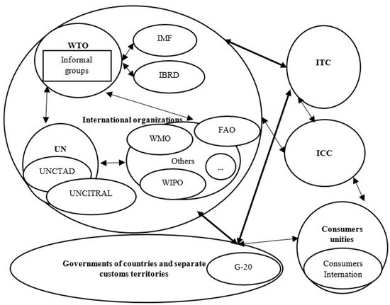The subject structure of the global trading system has been gradually broadening during its whole transformation period. Moreover, it is featured with both close cooperation among key players and institutions in the trading sphere and continuous contact with other subjects of the global economic system. Therefore, it is reasonable to distinguish such subjects of the global economic system on the current stage of the global trade development (Figure 1), which form tendencies, react against global challenges and determine major vectors of its evolution by their activity.