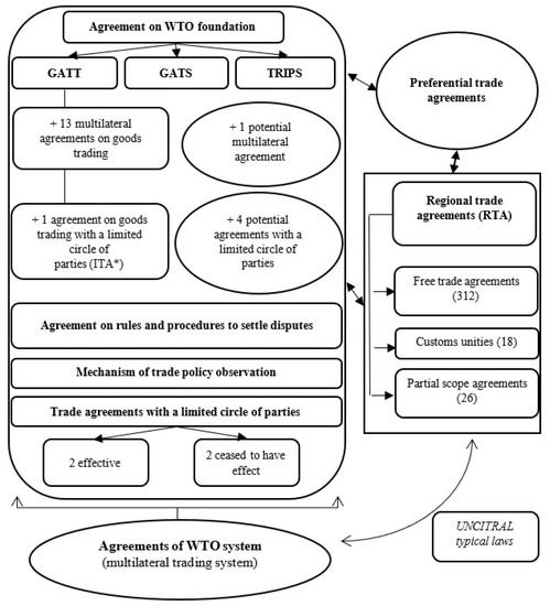Currently, the system regulatory framework includes 23 multilateral trade agreements, with a limited or unlimited number of parties, 349 effective regional trade agreements, 36 preferential trade agreements, a number of typical UNCITRAL laws, etc.