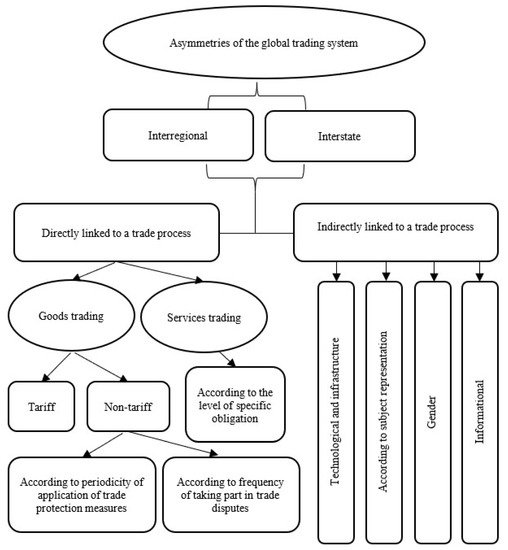 To be precise, in this research, global trading system asymmetries have been analyzed and systematized by being divided into two key groups—asymmetries that are directly linked to international trade processes (asymmetries in goods trading, caused by differences between levels of customs tariffs of countries and the number and variety of implemented nontariff measures of trade volume regulation, including the following trade protection measures: antidumping, compensational and special; in the degree of involvement of countries and separate customs territories in settling trade disputes; asymmetries in service trading that derive from differences between levels of specific commitments of countries to liberalize access to service markets) and asymmetries that are indirectly linked to international trade processes (technological and infrastructural, gender, informational, according to subjectivity and particularly considering the growing role of micro-, small and middle-sized enterprises in the export activity of countries).