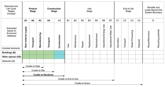 The case study conducted the predicted environmental impacts from the pre-use phase of the site plan of the first phase of New Skerjafjörður [39,44] from Cradle-to-Handover (A1–A5) for Buildings and Other Spaces domains as shown in Figure 4. The study assessed stages A1–A4 using process LCA, but A5 is estimated with information from the study by Heinonen et al. [18]. Networks were not included in the assessment.