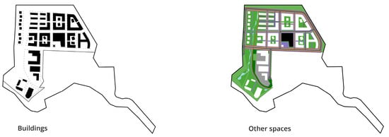 The site plan is divided into two main domains: Buildings (B) and Other Spaces (OS), as shown in Table 2. Each domain is divided into further separations where it becomes clearer how much environmental impact comes from each domain. The site plan separation into domains is a similar approach as done by other existing literature when conducting the neighborhood LCA studies discussed in the introduction. In relation to existing neighborhood literature, the study would have accounted for the Network domain as the third main domain that is a part of the construction of the neighborhood, but the Network domain will not be included in this study due to a lack of data. The LCA covers the construction volume of all the buildings planned within the Buildings domain (B), considering raw materials extraction, transport, manufacturing, and building construction is estimated with information from the study by Heinonen et al. [18]. Other space domains (OSs) cover the infrastructure construction for cars, bicycles, and pedestrians, as well as open space, and parking areas mostly made up by constructing a parking house. All construction volumes are shown in Table 2. A diagram of the domains included (Building and Other Spaces) is shown in Figure 5.