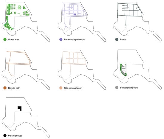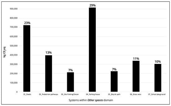 The estimated construction load for the Other Spaces (OS) domain was calculated from the site plan and other supporting documents [40,45]. Additional information used were preliminary road designs received from Reykjavík’s environment and planning department to account for the material load with process LCA. The Other Spaces (OS) domain is divided into seven systems, as shown in Figure 6. Table S15 in Supplementary Materials shows the system division, and under each system, the main materials are listed, as well as the quantity of each material. In Roads, the calculation was carried out by using Ecoinvent 3.71 to run the quantity of the surface material and also using an LCA report for typical road construction in Iceland by the EFLA engineering office [50]. The parking house was calculated in the same way as the building systems were accounted for in the Buildings (B) domain. For Pedestrian pathways, Site parking/green, Bicycle paths, Grass areas, and School playgrounds, the study focused on surface materials only due to a lack of data and for simplification. Table S16 in the Supplementary Materials shows the material load and impacts within each impact category for the different systems within the Other Spaces domain.