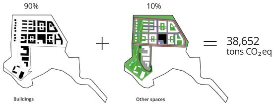 Emissions per square meter of the built-up area of Buildings and Other Spaces domains (178,850 m2) for climate change are 216 kg CO2eq per m2. However, when the domains are studied separately for the Buildings domain (98,950 m2) the climate change impact is 359 kg CO2eq per m2, and for the Other Spaces domain (79,905 m2) 39 kg CO2eq per m2. The results for the total impact for one m2 of the gross area in all of the impact categories assessed are shown in Supplementary Materials in Table S18.