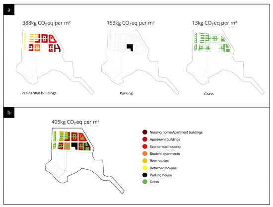 The result for the residential buildings (Figure 8a) is 388 kg CO2eq per m2, for the parking house 153 kg CO2eq per m2, and for the grass area 13 kg CO2eq per m2. When combined together, all emissions from residential and related spaces are 405 kg CO2eq per m2 of residential space (67,520 m2), as shown in Figure 8b. The parking house is considered highly relevant as a related space to the residential buildings since no parking is allowed on the residential sites themselves. The results for the total impact for one m2 of the gross area of all residential and related spaces in all of the impact categories assessed are shown in Supplementary Materials in Table S19.