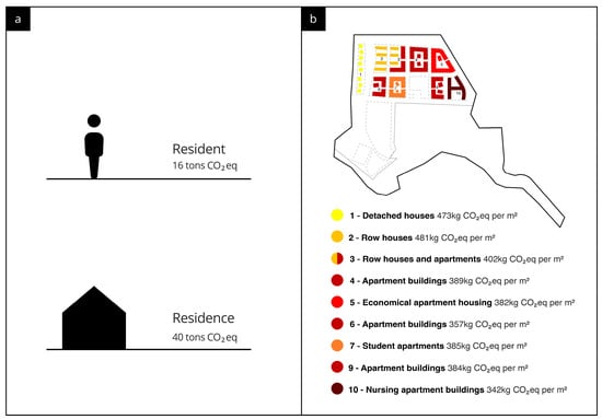 (a). Shows the impact (kg CO2eq) per resident and per residence of the neighborhood. (b). Shows the impact (kg CO2eq) for one m2 of gross residential space of the different building types of each site.