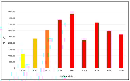 Shows the impact (kg CO2eq) for the gross distribution of building load for the different residential sites of the neighborhood.