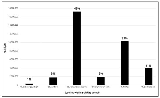 A hotspot analysis was conducted to study the emission load coming from different building systems. Within the Buildings domain, the assessment covered six of the eight building systems (Table 3). Frame and Roof Structure contribute the largest share of the six systems studied, with 49% of the total climate change impacts, and the second is Finishes, with 29%, as shown in Figure 11. The impact of the gross distribution shows that Frame and Roof Structure contribute 17,319 tons of CO2eq, and Finishes contribute 10,310 tons of CO2eq within the Buildings domain. Results for the different building systems and their percentage of contribution to the overall impacts for each of the assessed impact categories are shown in Supplementary Materials in Table S22.