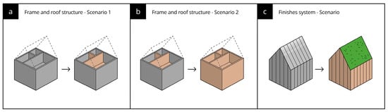 (a). The frame and roof structure diagram of scenario 1 (concrete replaced with CLT timber structure for all internal walls, stairs, and roof structure). (b). Scenario 2, where the external concrete walls are also replaced with CLT timber structures. (c). Diagram of the replacement scenario for the Finishes system where aluminum claddings are replaced with timber and aluminum roof replaced with grass.