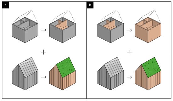 (a). Frame and Roof Structure scenario 1 and replacement scenario of the Finishes system. (b). Frame and Roof Structure scenario 2 and replacement scenario of the Finishes system.