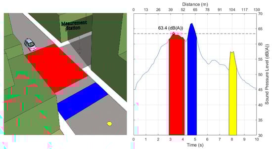 Projects such as HARMONOISE have developed and validated methods to assess traffic noise emission [47]. The IMAGINE project studied the discrimination of rolling noise subsources and their emissions [48]. The maximum A-weighted Noise Level () and Sound Exposure Level () were the metrics used to determine and model the noise emissions of tire-road interaction. Additionally, as explained in [24,50], can describe acoustic emissions for speeds higher than 60 km/h.