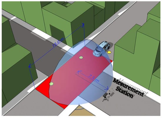 It is suggested that measurement stations be placed at crossroads (Figure 3) or T-intersections (Figure 1). The microphone position is 7.5 m from the center of the lane and at a height of 1.2 m from the ground. Because the proposed modification of the CPB method is meant to be applied in densely populated places, any façade reflections or acoustic shadows of buildings must be outside a quarter-sphere with the radius being the microphone distance, as illustrated in Figure 4.