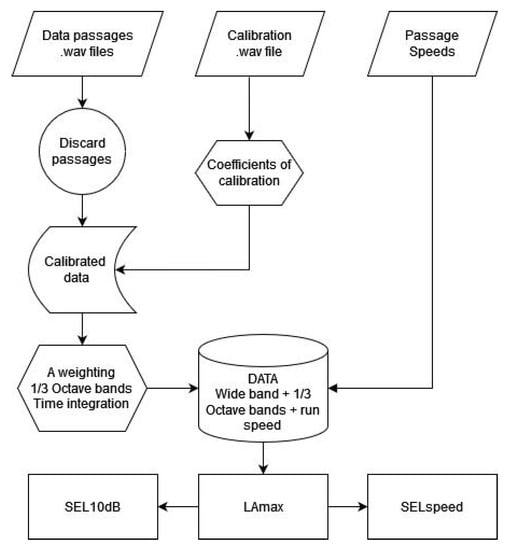 Signals obtained through this pass-by methodology follow the flow diagram depicted in Figure 5. Data analysis is designed for processing data by session. In this way, the performance of different combinations of vehicle, tire, and asphalt can be registered for later performance comparisons or fleet evaluation.