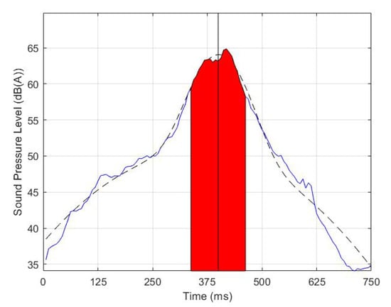 The blue line in the figure corresponds to the time-integrated A-weighted signal, while the black dashed line indicates the double Gaussian fitted model estimated for a single passage and the centered vertical black line indicates the maximum point of the double Gaussian function.