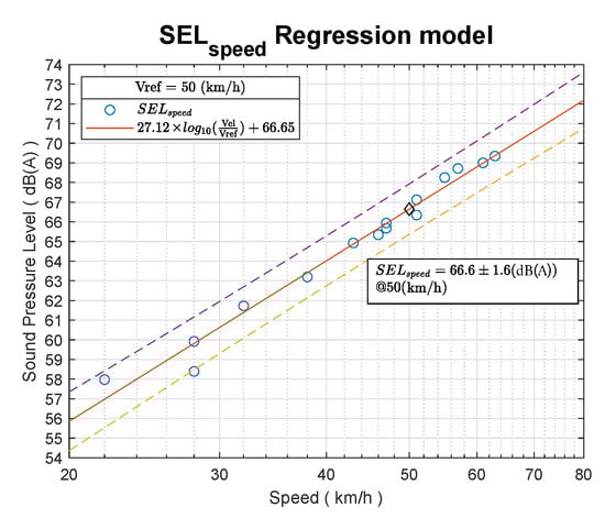 A logarithmic regression of the wideband values and speeds is performed to build a model which predicts the behavior of the noise emission. The reference speed applied to the regression is in accordance with the speed limit of the test site, e.g., 50 km/h. A linear logarithmic plot is used to represent the regression with and values. Figure 7 shows the regression of the measured values and the predicted curve of the model. The global result, presented inside the box, contains the predicted value at 50 km/h with an expanded uncertainty with 95% confidence. In addition, one of the combined uncertainties is related to the standard error of the intersection of the curve and the reference speed, and Type B instrumentation uncertainties were considered.