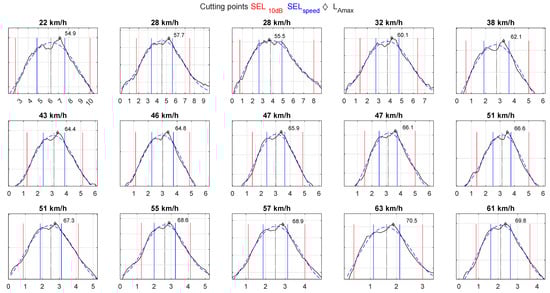 The third sample, at 28 km/h, depicts a longer temporal window compared to the rest of the samples. In consequence, this difference in window size allows for confirmation of outliers, as can be observed in Figure 7 and Figure 9. Other examples of repeatability of the method are at 47 km/h and 51 km/h, where the greatest difference is less than 0.7 dB(A). Note that the confidence interval of the regression, on which the global result is based, depends on the correct selection and discarding of the signals.
