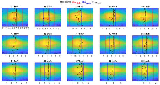 In wideband, identification of outliers cannot be easily accomplished, as no notable particularity can be observed. Outlier recognition is achieved by spotting the time delay along the third octave bands, especially for mid–high frequencies. For instance, the third sample in Figure 7, Figure 8 and Figure 9 at 28 km/h shows a clear scattered distribution of black triangles, and a clear unbalanced shift in the time delay is visible from 800 Hz to 6.3 kHz. Thus, it can be assumed that the vehicle’s pass-by emission is being masked by other noise sources.