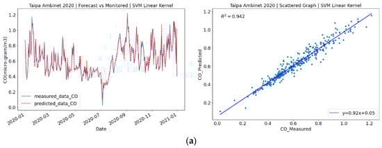 (a) Measured and predicted CO (48-h) concentrations using SVM for 2020; (b) PM2.5 (48 h) concentrations using SVM for 2020; (c) PM10 (48 h) concentrations using RF for 2020.