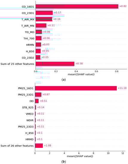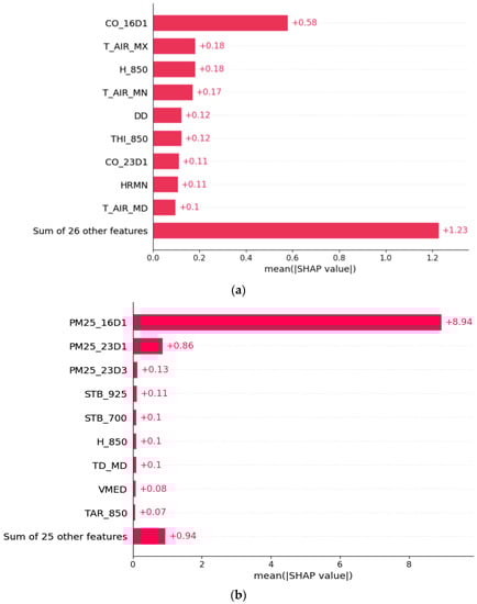 Figure 5 shows the SHAP values of each variable in different models, with CO_16D1 being the most important feature and T_AIR_MX being the second most important feature that contributes to the prediction results. The other features with contributions to the model are TD_850, H_850, WDIR, T_AIR_MN, DD, T_AIR_MD, and STB_700. It shows that PM25_16D1 is the most important feature, while PM25_23D1 is the second most important feature that contributes to the prediction results. The other features with contributions to the model are STB_925, STB_700, H_850, TAR_850, VMED, and TD_MD. Also, it shows that PM10_16D1 is the most important feature, while PM10_23D1 and THI850 also show a significant contribution to the model.