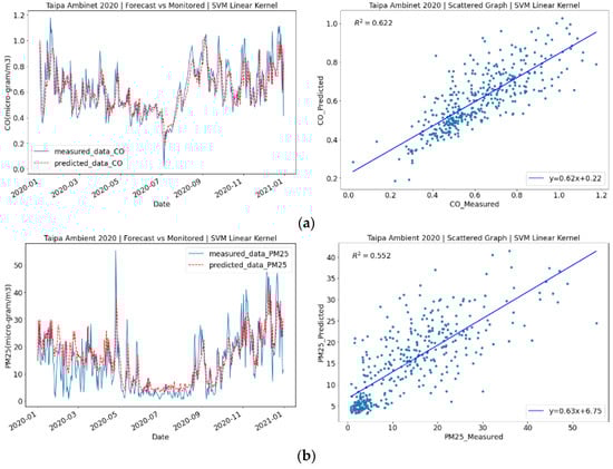 Figure 2 shows the prediction results and the observation values of CO using the SVM model, PM2.5 and PM10 using the RF model in 2020, which gave the highest R2 value of 0.94, but it was difficult to forecast the high pollution episodes. The regression plot shows that the overall trend of the predicted value fits within the observation value. The R2 value is 0.88 for the PM2.5 forecasting model, which is a very promising result in this work. The high pollution episodes could be well predicted. It shows that many predicted values are higher than the observation value. The RF model shows the best result of R2 being 0.92 for PM10, with the prediction value slightly higher than the observation value, which shows that the trend of PM10 was well predicted by the RF.